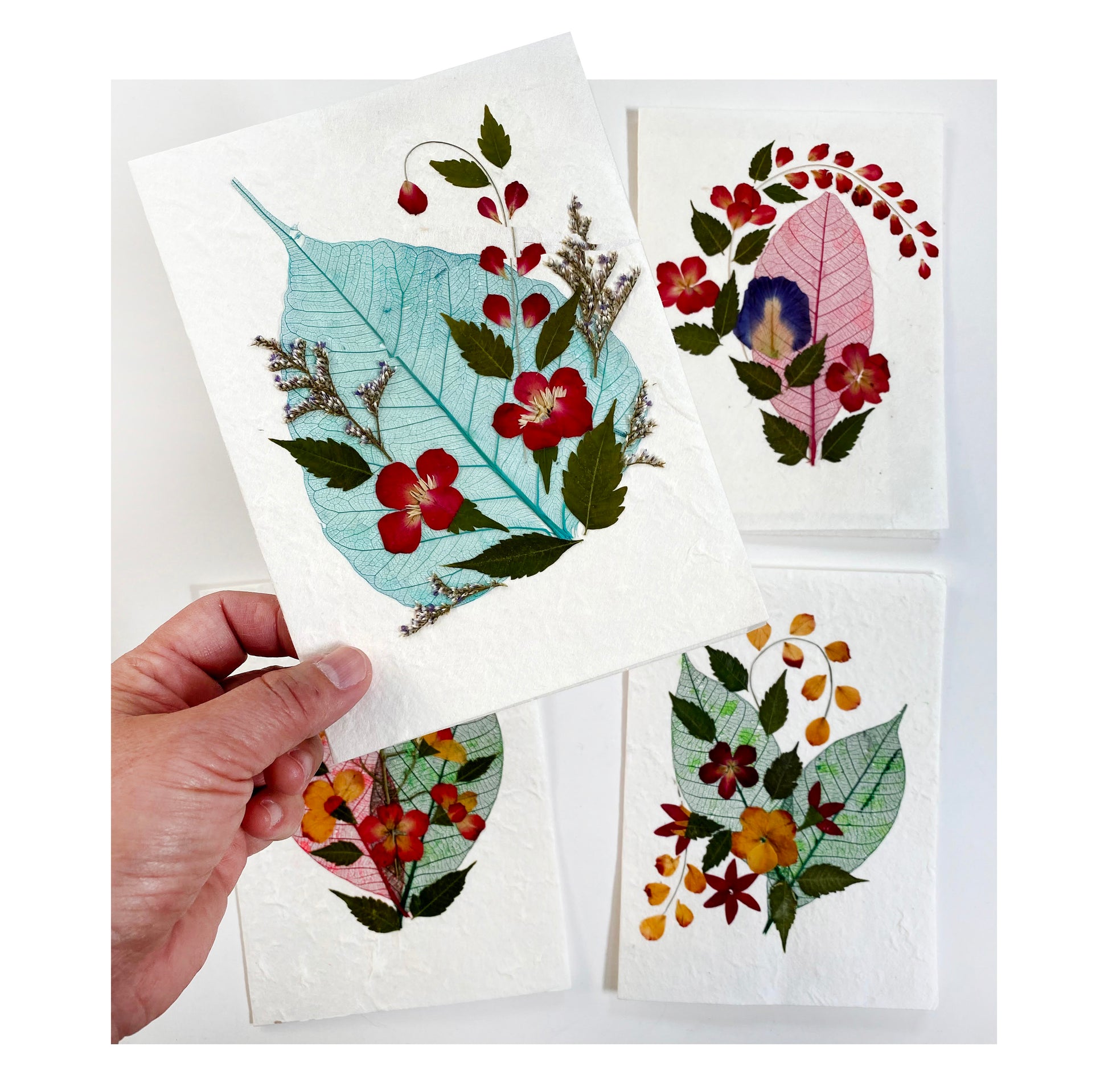 Sunne Tropical 4 Cards Random Pack Handmade Mulberry Paper Greeting Card 5x7 Inch Real Pressed Flowers- Skeleton Bodhi Leaf & Skeleton Rubber Leaf